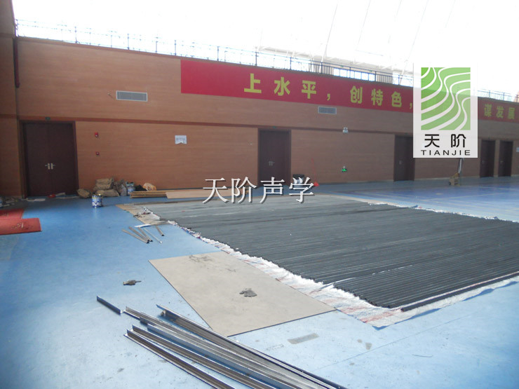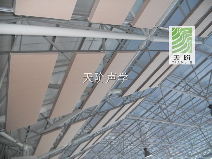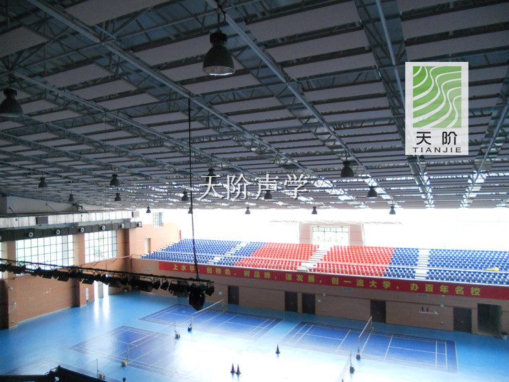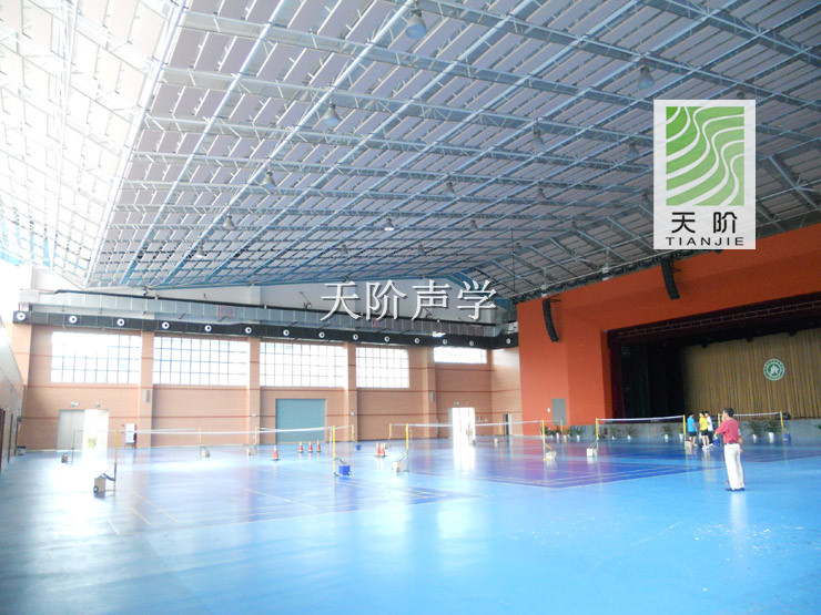 韶關(guān)市乳源縣體育館位于乳源縣城北郊,旁邊有乳源高級中學(xué),面臨京珠高速公路。此工程今日正式完工,它使用了多種天階牌吸音材料,由于體育館容積大,自由聲程過大,容易產(chǎn)生回聲和多重回聲。使人聽音渾濁,干擾音響設(shè)備的正常運(yùn)行。在體育館的墻面安裝了槽木吸音板聚酯纖維吸音板等聲學(xué)材料。     同時(shí)體育館頂棚也裝有具高效天階平板吸收性能的空間吸聲體。天階平板空間吸聲體是由優(yōu)質(zhì)玻璃纖維棉、定制鋁質(zhì)邊框、吸音防塵玻纖布組成。它是其他聲學(xué)材料吸聲行能的2倍。從而大大減少了體育館的回聲