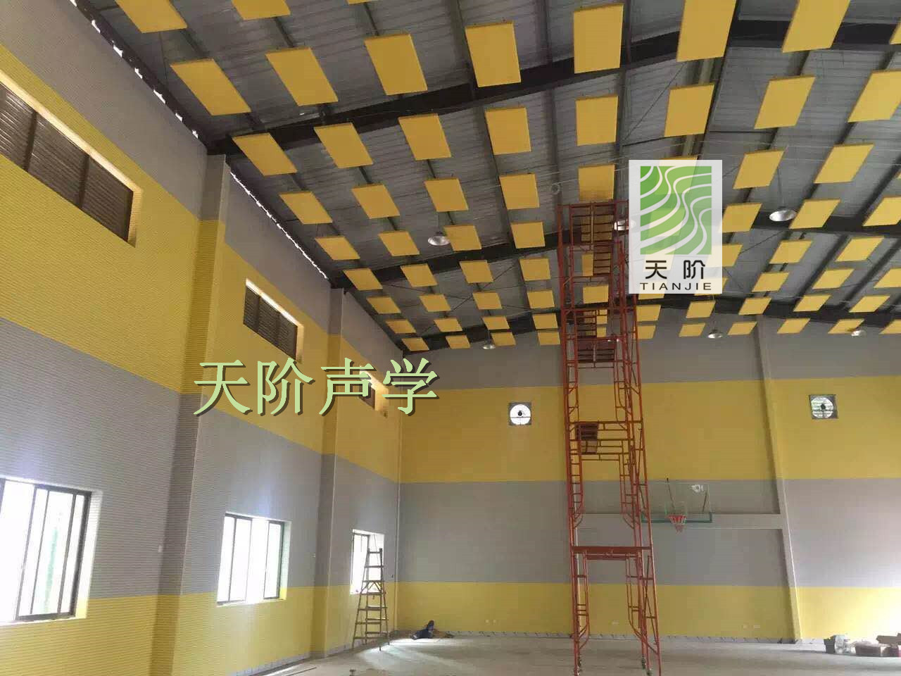 常德南源實驗學校需要建一所室內(nèi)體育館。學校特地邀請了專業(yè)的聲學設計師進行設計,選用了平板空間吸聲體。空間吸聲體是一種懸掛在頂棚具有高效吸收性能的吸聲材料。空間吸聲體一般水平或者垂直吊掛。
