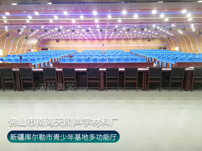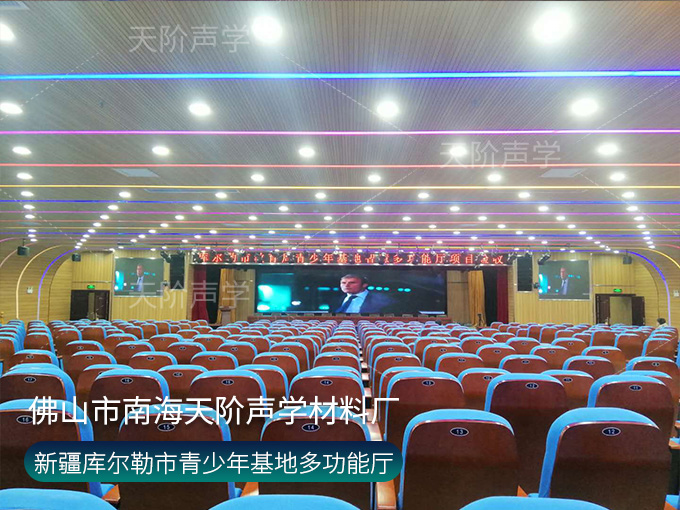 新疆庫(kù)爾勒市青少年基地智慧多功能廳項(xiàng)目,天花板和墻面都選用槽木吸音板,基材采用不燃玻鎂基材,安心安心。