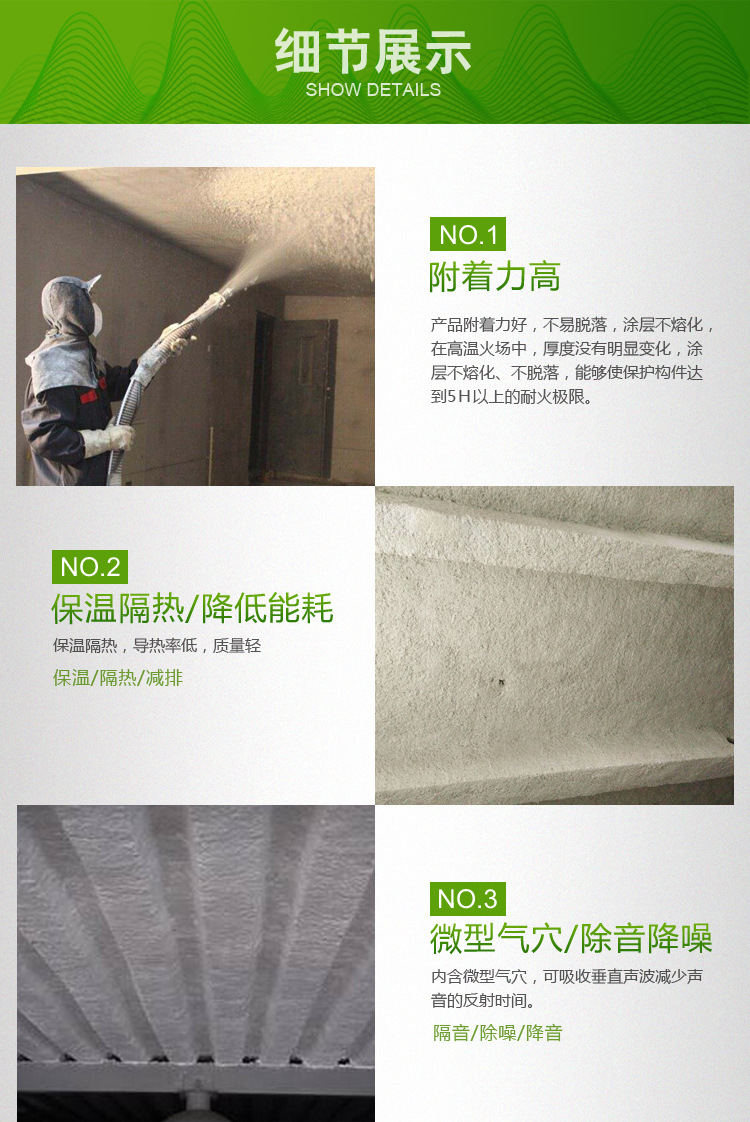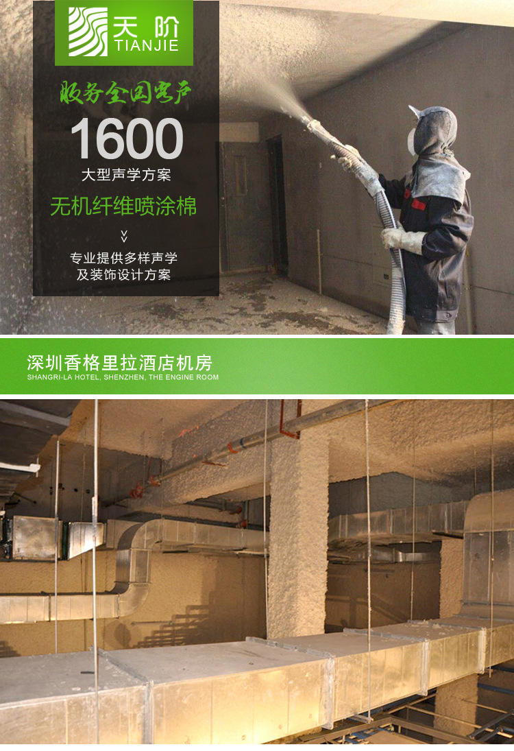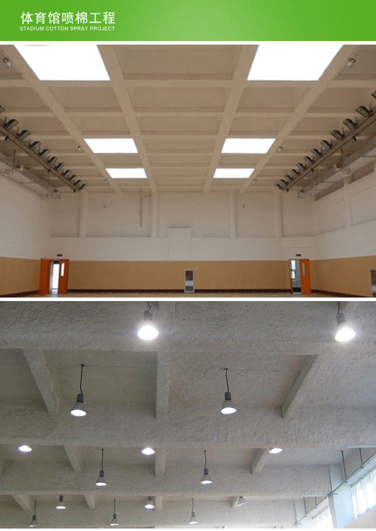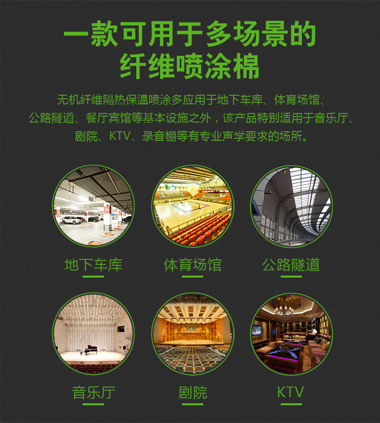 無機(jī)纖維隔熱保溫噴涂除能應(yīng)用于地下車庫、體育場館、公路隧道、餐廳賓館等基本設(shè)施之外,該產(chǎn)品特別適用于音樂廳、劇院、KTV、錄音棚等有專業(yè)聲學(xué)要求的場所。