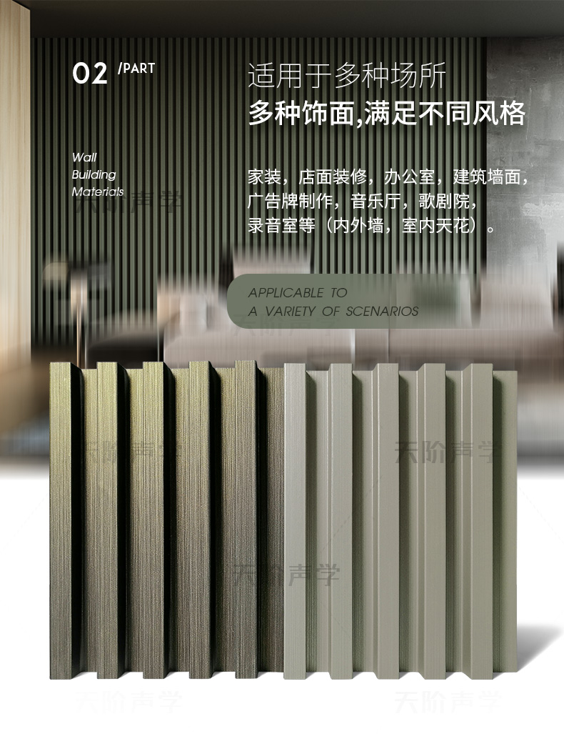 適用場所:家裝,店面裝修,建筑墻面,廣告牌制作,音樂廳,歌劇院,錄音室等(內外墻,室內天花)。
