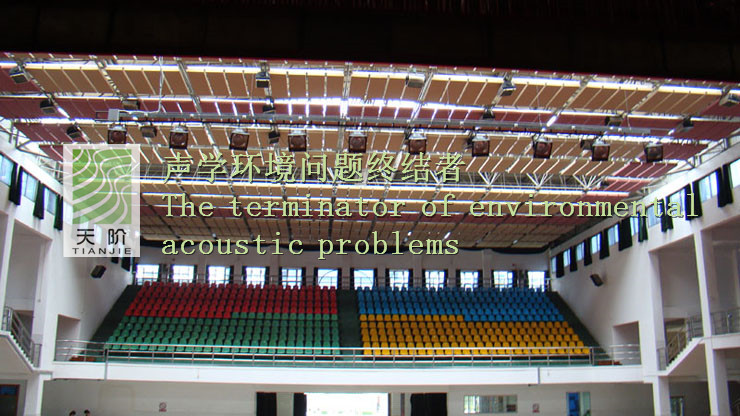 東莞中學(xué)體育館采用的是空間吸聲體。空間吸聲體是一種懸掛在頂棚具有高效吸收性能的吸聲材料。空間吸聲體一般水平或者垂直吊掛。空間吸聲體面積占頂棚面積30%-40%時(shí)其材料的吸聲性能是其他聲學(xué)材料吸聲性能的2倍。