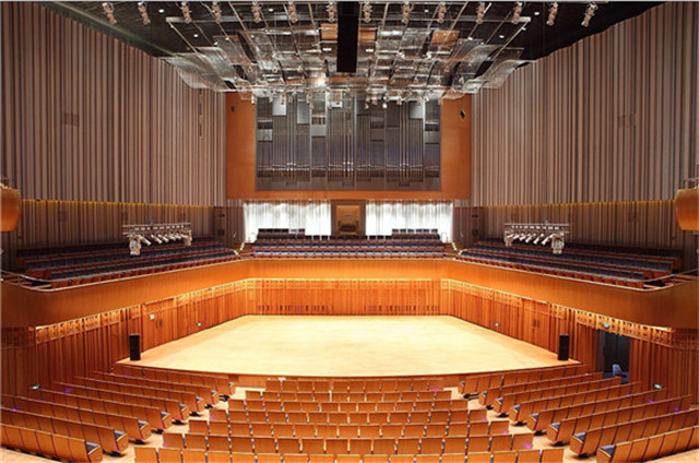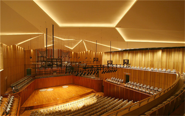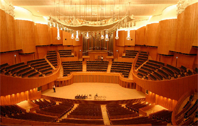 例如,在打開窗戶的那一面,由于完全不反射它所碰到的聲音能源,因而吸音率為100%,亦即該面為完全吸音面,但同時也可能有完全無法隔音的面存在。室內之吸音程度大時,即能壓制室內的擴散音并降低噪音水平。此方法系遠離噪音源和影響點時會有效果,但若室內各處都有噪音源且和影響點之距離相近時,例如窗邊的座位對由窗戶入侵的聲音,因為噪音的直接影響太大,故而其藉由吸音所產生的隔音效果不會太顯著。音樂廳聲學設計的指標一流的具有高雅文化氛圍的專業性音樂廳可供自然聲演出,并適應多種風格的音樂作品演出。