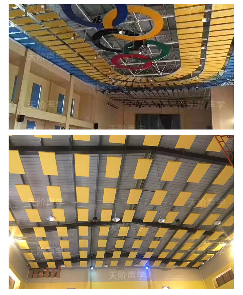 果基本相同。水平懸掛板狀空間吸聲體的離頂高度一般為房間凈高的1/5至1/7左右,一般來說,考慮到施工的難易程度,空間吸聲體懸掛在建筑頂部的鋼架以下,其高度剛好會在