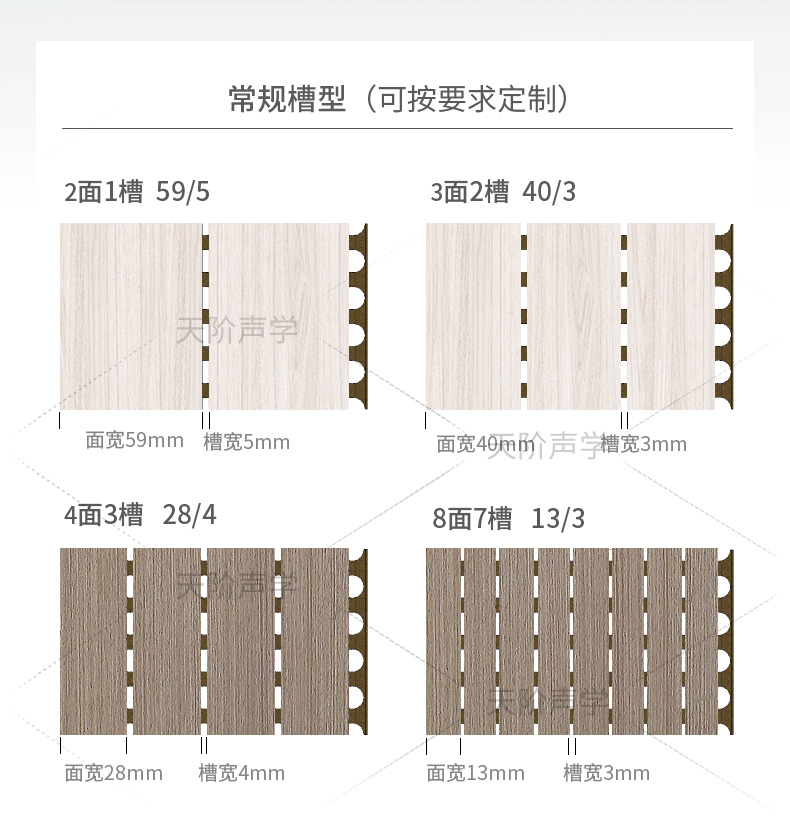 天階聲學材料廠生產的此種天階槽木吸音板由一系列彼此等槽距條組成,通過對槽背面孔徑的大小,深淺,正面槽的寬度,深度以及穿孔率進行嚴格的核算,從而在不同的頻率上取得理想的吸聲效果,有效控制聲波的反射和擴散,消散雜波和噪音,令室骨有合理的混響時間,達到締造音質的吸音效果。