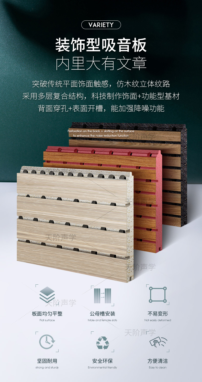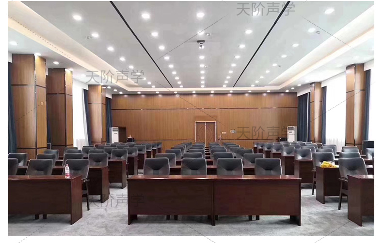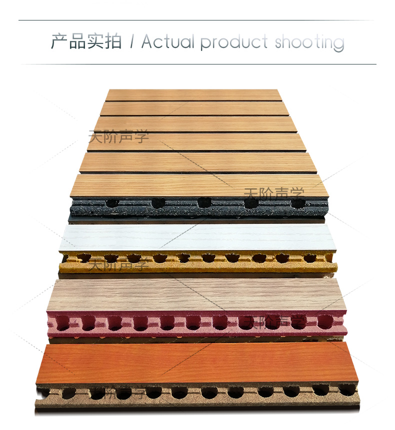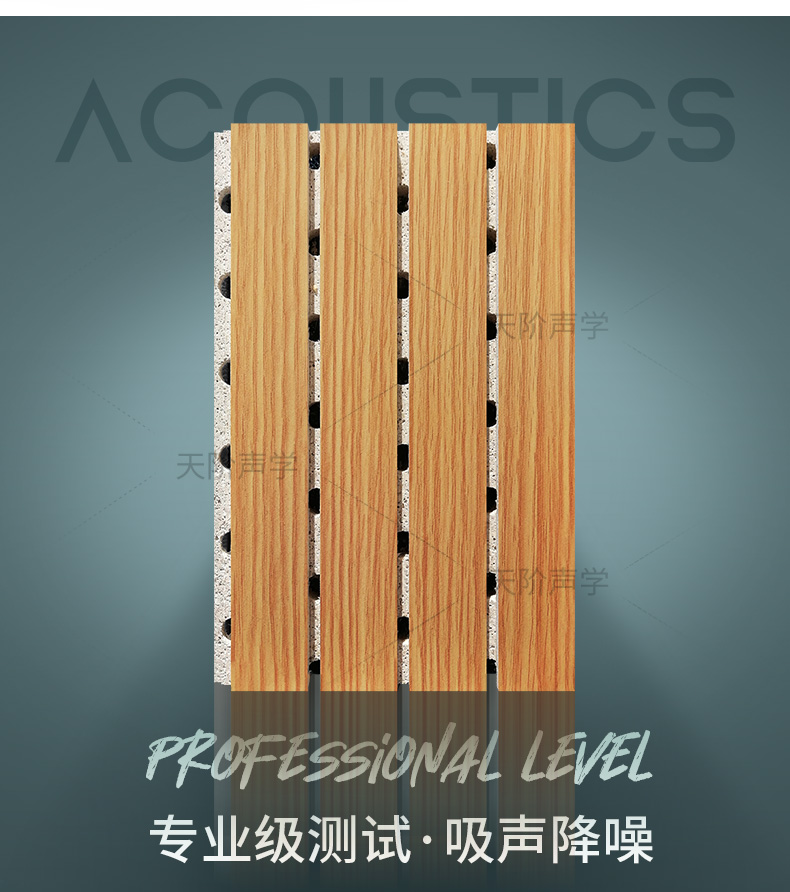 陶鋁裝飾吸音板采用多種不同的無機材料的組合,以無機材料為主要材料,通過添加導電瓷土粉、導電云母粉等導電材料、增強纖維等材料,采用無機黏合劑粘合,自然固化的方法而 成的特殊板 材,再在其表面復合多種不同的裝飾材料,從而形成不同的裝飾效果。實現吸聲的技術原理是:一是在材料本身內形成多孔結構,達到一定的吸聲效果,其二是在成 品板上通過開槽、鉆孔形成穿孔板共振結構,達到吸聲效果。并配合吸聲無紡布進一步提升吸音效果。
