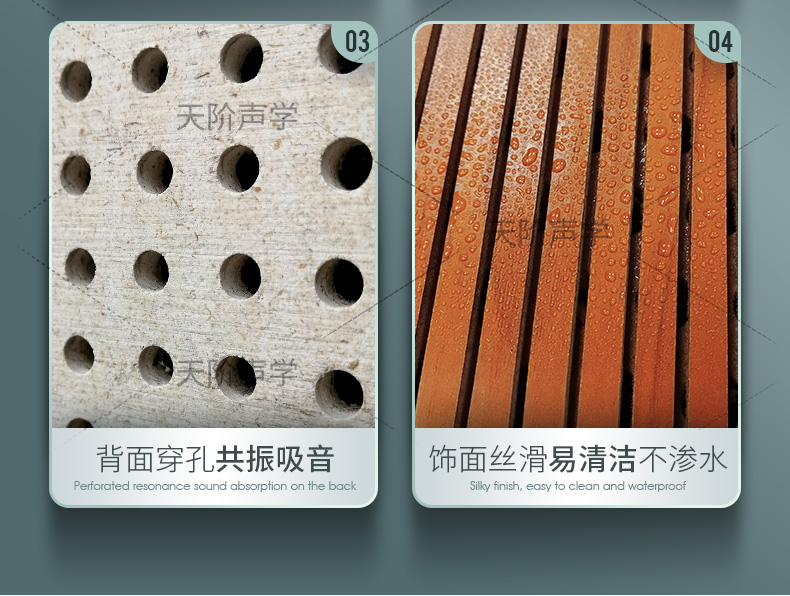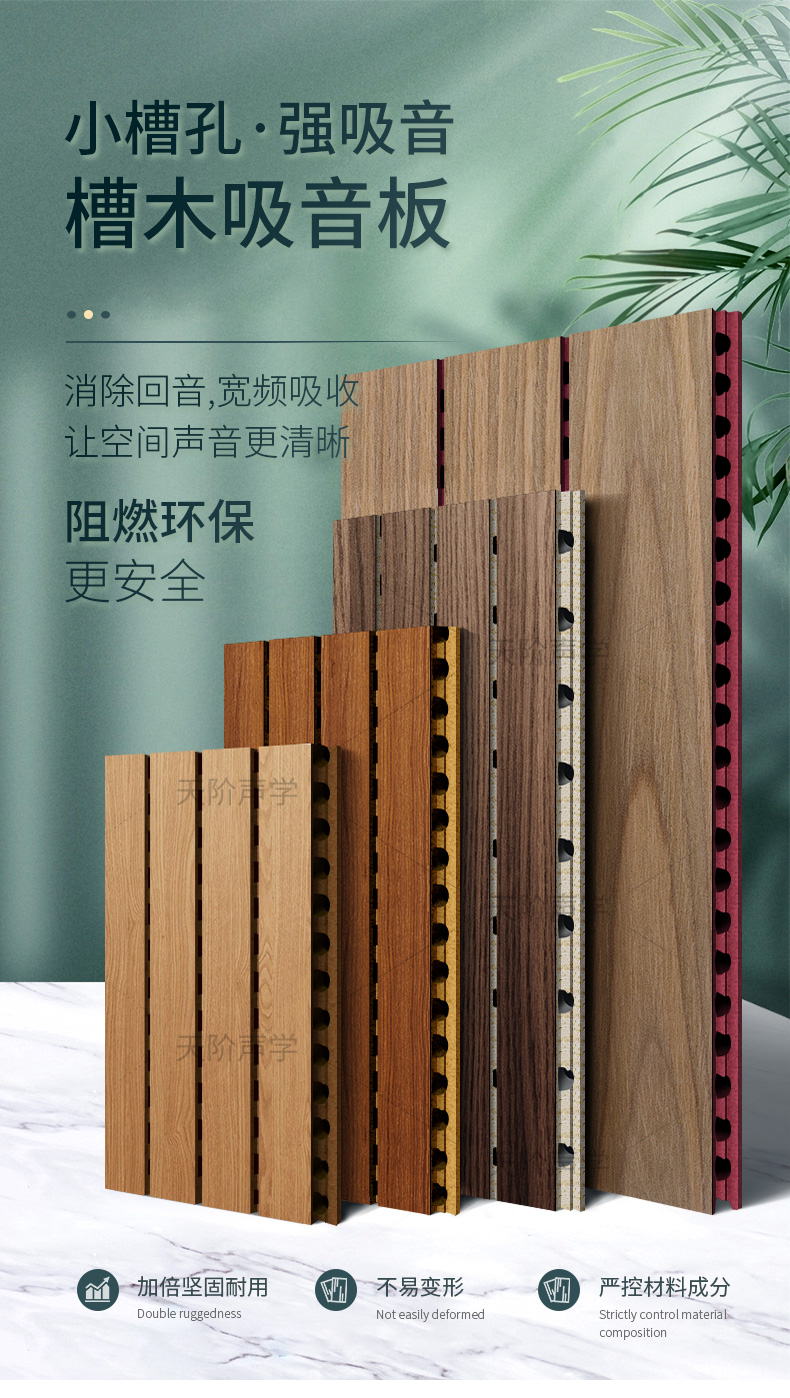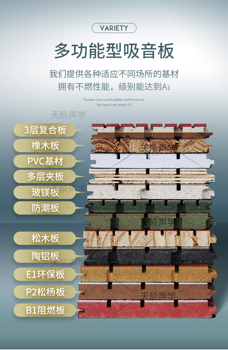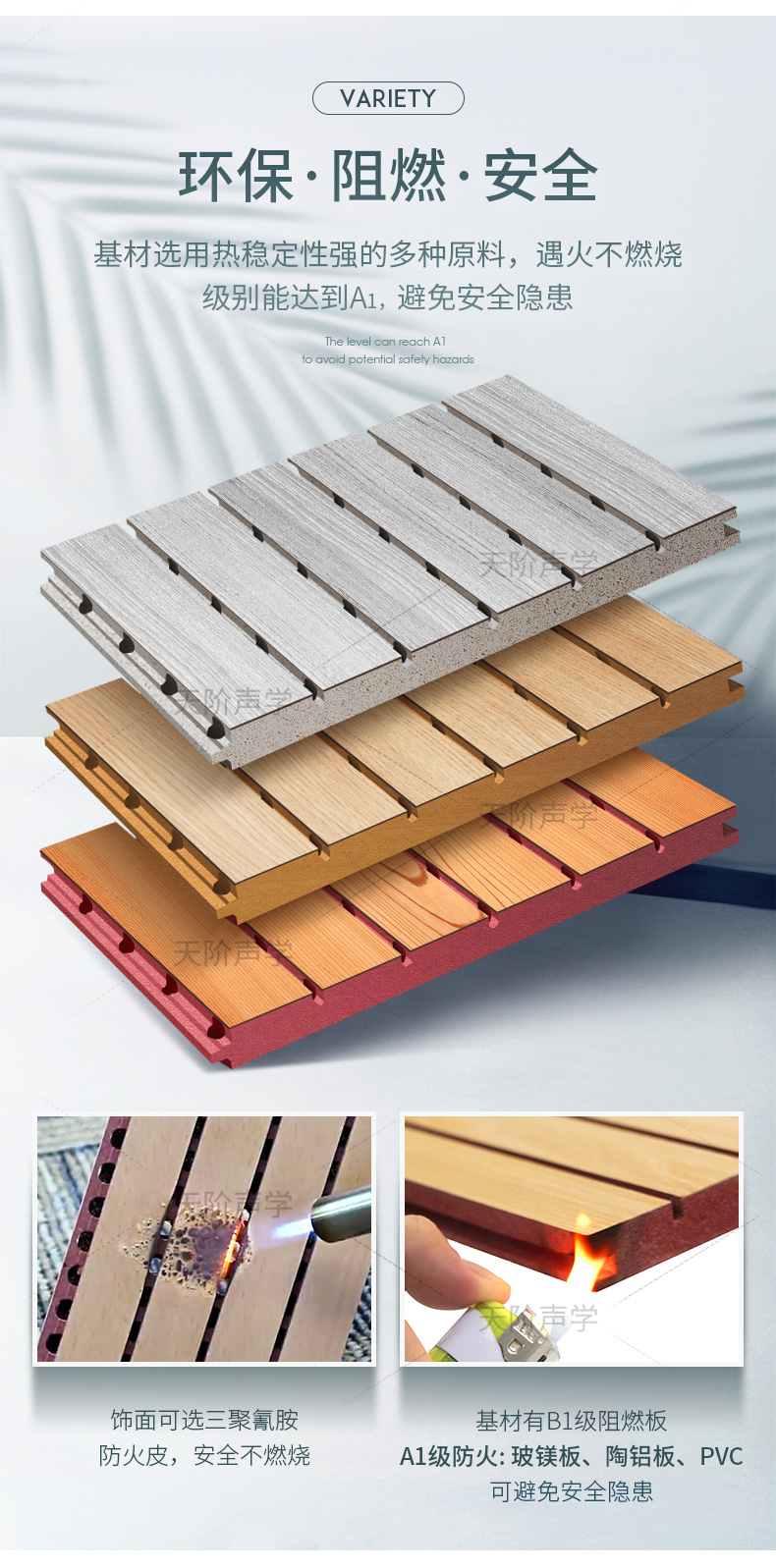陶鋁裝飾吸音板采用多種不同的無機材料的組合,以無機材料為主要材料,通過添加導電瓷土粉、導電云母粉等導電材料、增強纖維等材料,采用無機黏合劑粘合,自然固化的方法而 成的特殊板 材,再在其表面復合多種不同的裝飾材料,從而形成不同的裝飾效果。實現吸聲的技術原理是:一是在材料本身內形成多孔結構,達到一定的吸聲效果,其二是在成 品板上通過開槽、鉆孔形成穿孔板共振結構,達到吸聲效果。并配合吸聲無紡布進一步提升吸音效果。