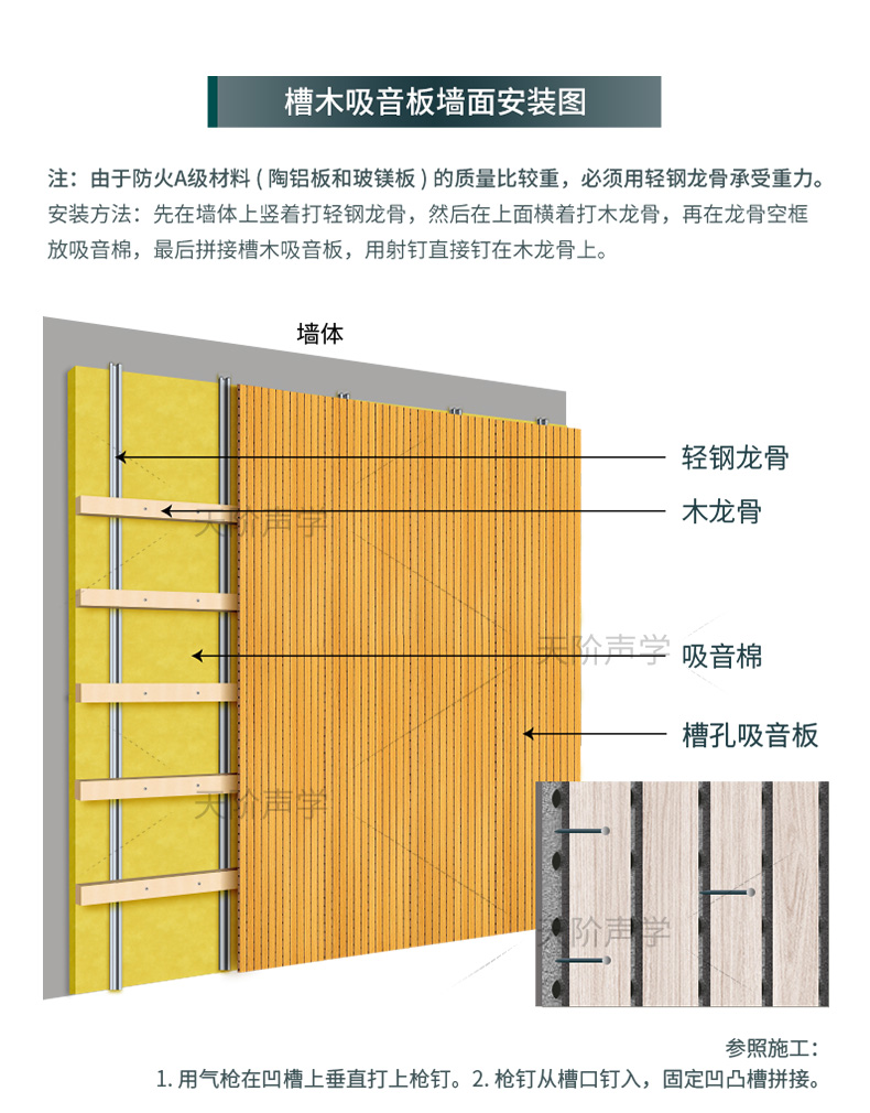 (3)如果吸音板從地面開始按橫式安裝,則長面的凹口要朝下安裝并用扣片鎖緊,一塊接一塊再將其他