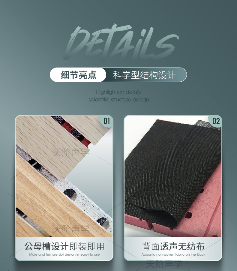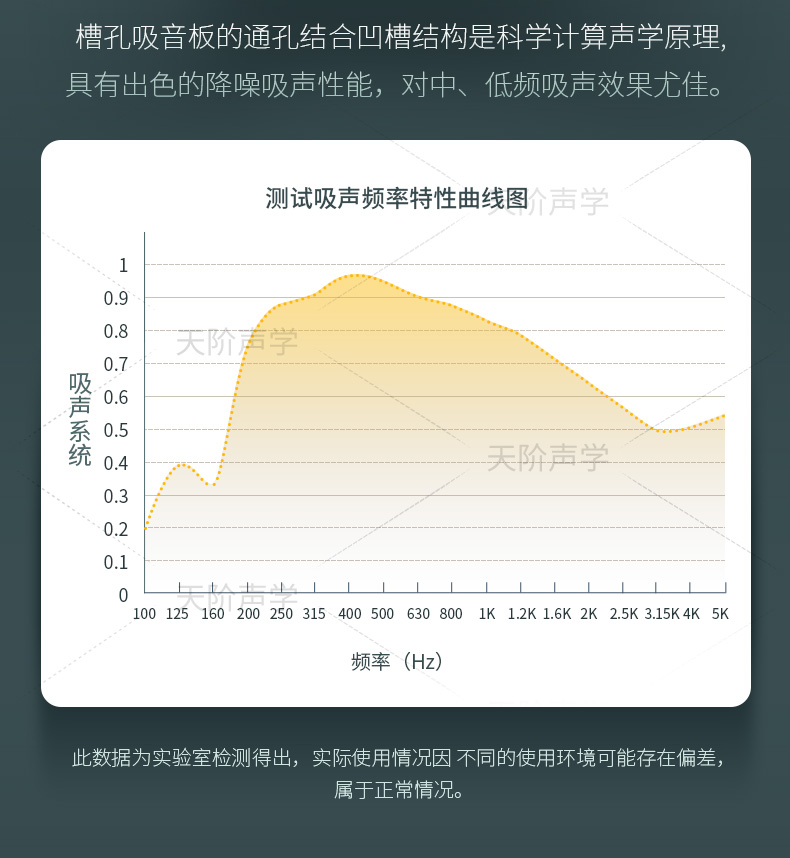 采用了多種材質和多層結構,根據聲學原理,合理配合,具有出色的降噪吸聲性能,對中、高頻吸聲效果尤佳。