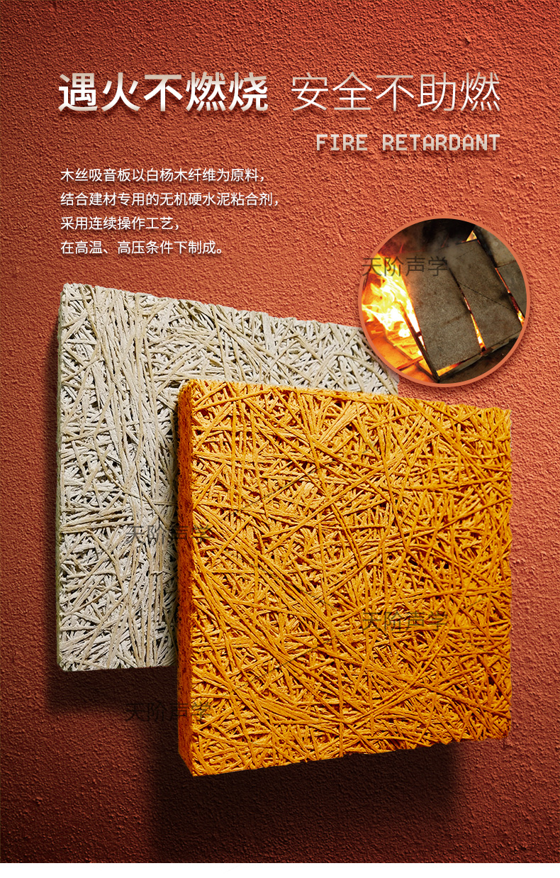 木絲吸音板以白楊木纖維為原料,結合獨特的無機硬水泥粘合劑,采用連續操作工藝,在高溫、高壓條件下制成。該產品擁有只有通過合成若干不同的建筑材料才能獲得的物理特性。